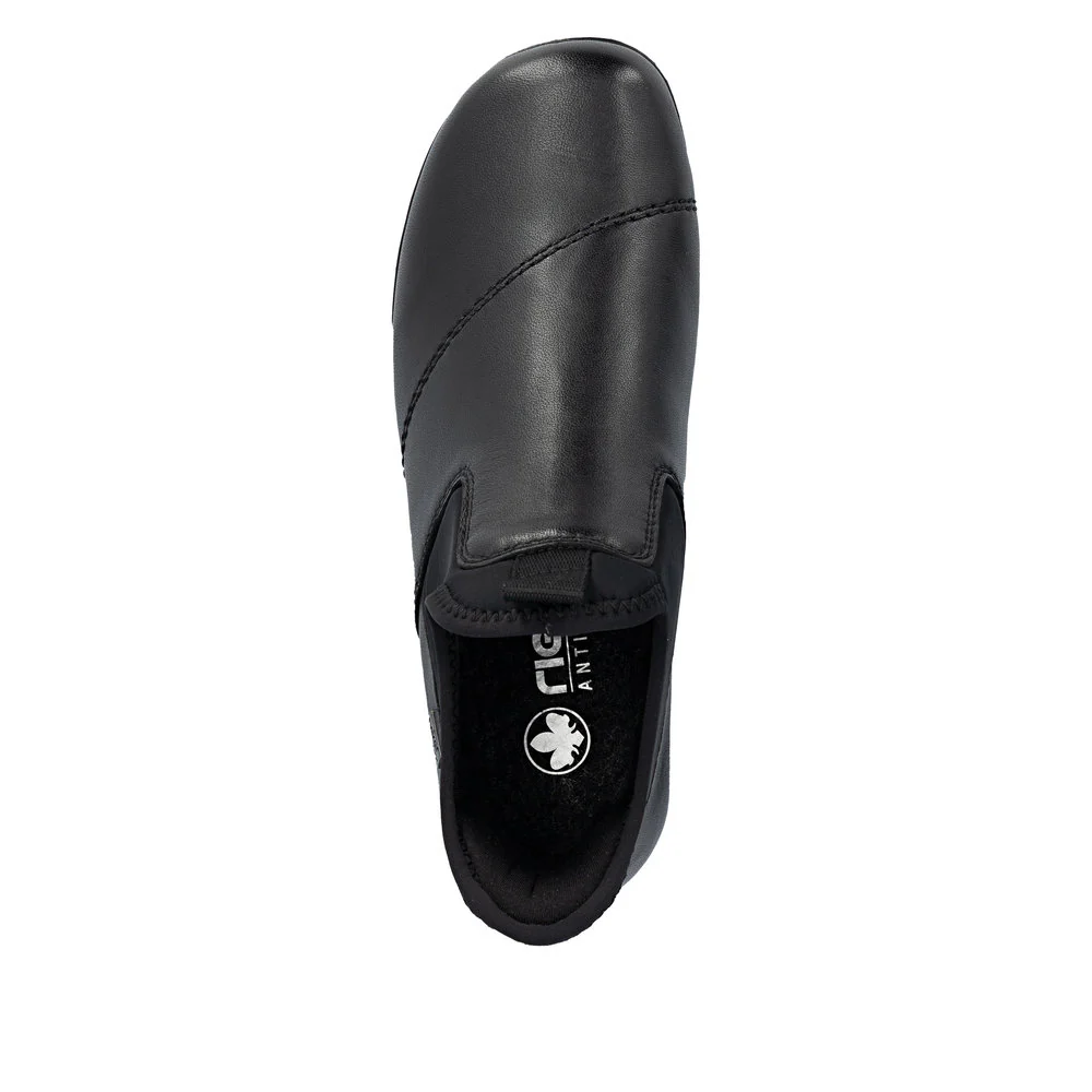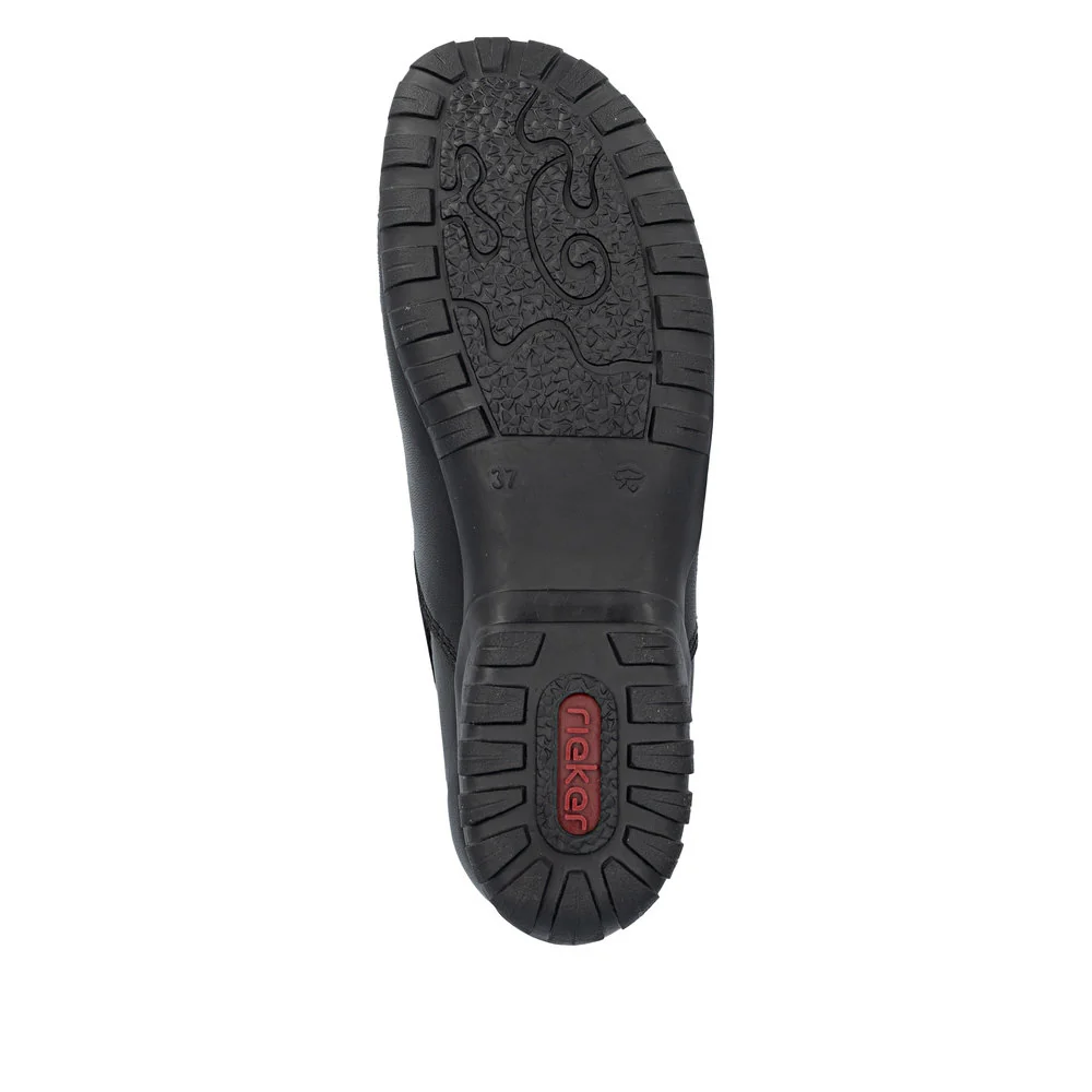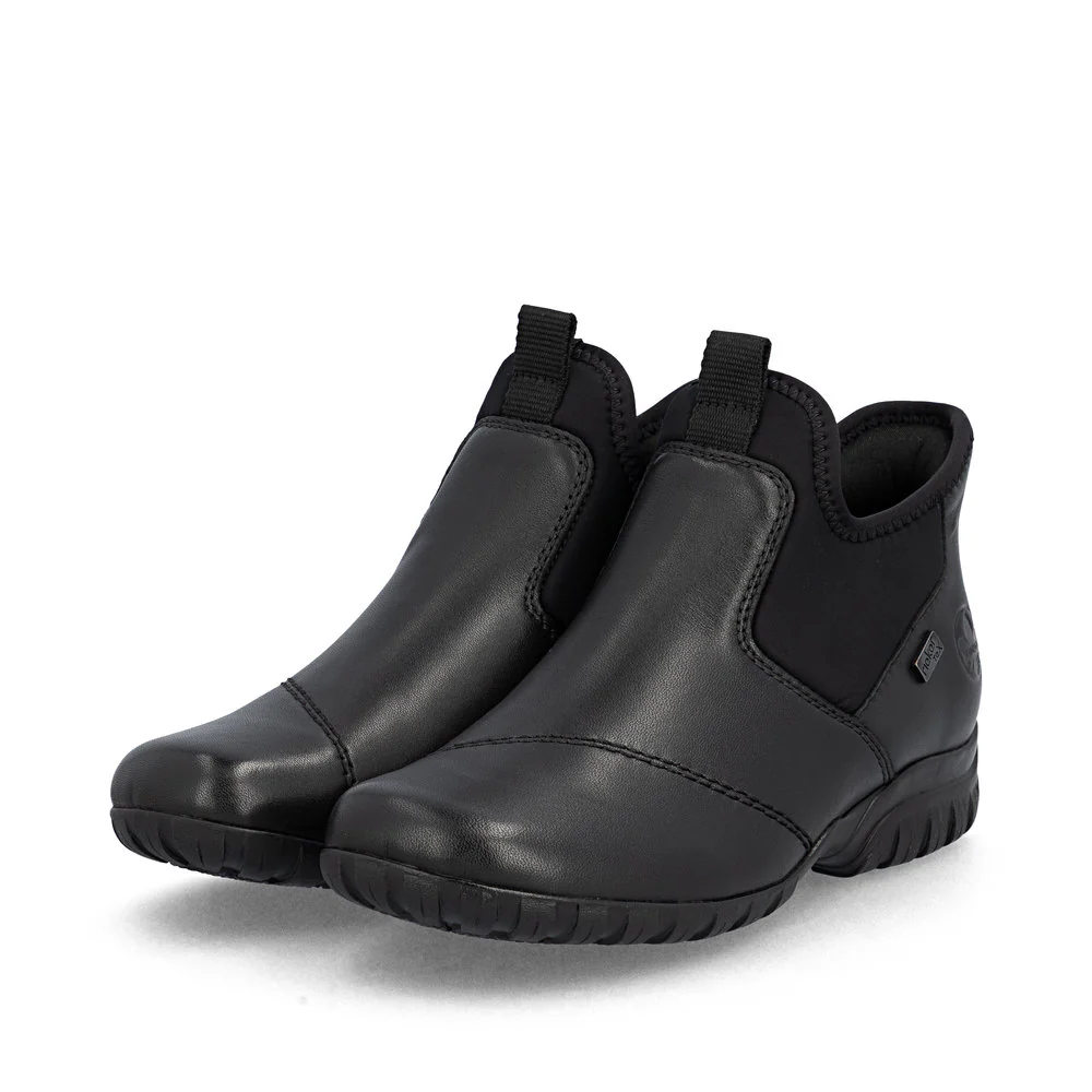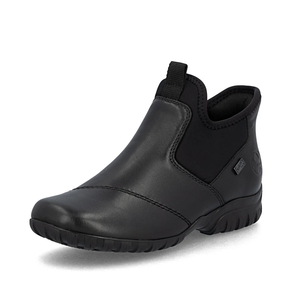 Ready2GO! These black Rieker ankle boots made of smooth leather not only look super fashionable, they also protect your feet from the cold. Made with the stitchdown construction, the model is robust, flexible and offers a perfect fit. There is no need for a fastener, as the elastic shaft collar allows the shoe to be put on quickly and easily. The grippy sole makes every step a safe affair. With the removable insole, the boots have another practical comfort feature. The extra width offers enough space for the feet to feel comfortable even when worn for longer periods. The combination of the water-repellent RiekerTEX membrane and the dimensionally stable Ready2GO feature makes this shoe particularly practical. With the soft warm lining, the shoes are perfectly equipped for cold temperatures. Nothing stands in the way of long walks!