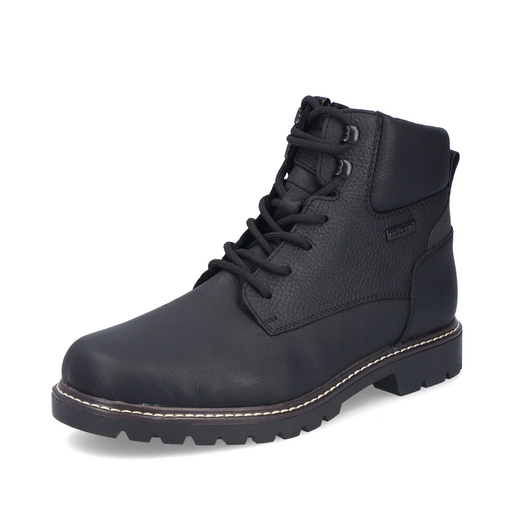 Stylish through the season! These casual black Rieker biker boots made of smooth leather are cozy companions on all your paths. In addition to the lacing, this model is equipped with a zipper that provides optimal support. The striking eyelets add a fashionable touch to the design. The sole is grippy and ensures a good traction at all times. In addition, the cover sole is extra soft. The model is cut in comfort width that ensures sufficient space for the foot. The RiekerTEX technology keeps the feet dry, while the Fiber-Grip sole offers extra grip on icy floors. Comfortably warm and moisture-regulating lamb fur makes these boots the perfect companions no matter when, no matter where! The minus temperatures have the cards stacked against them!