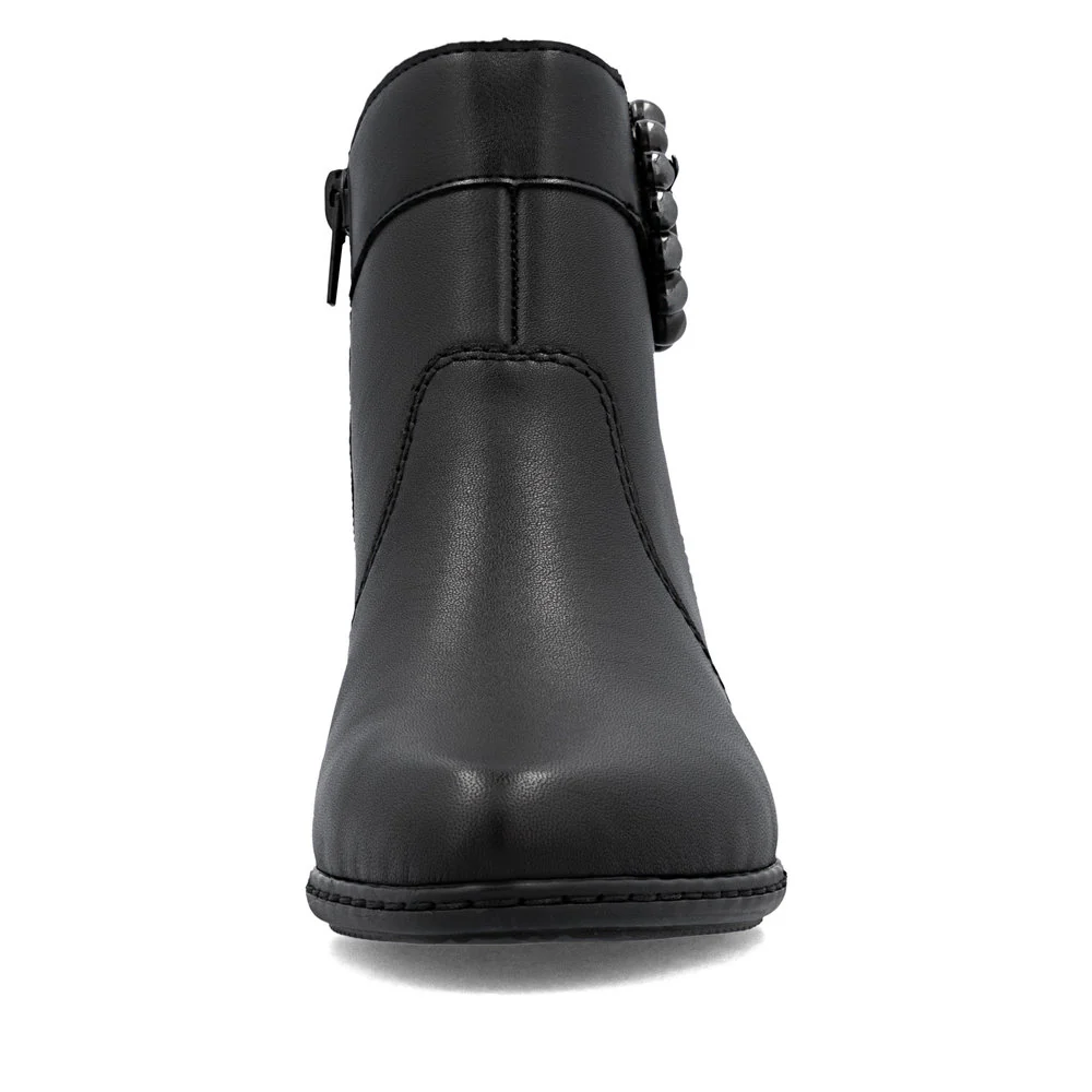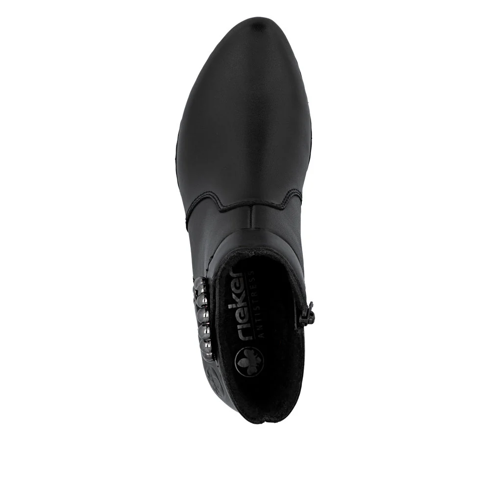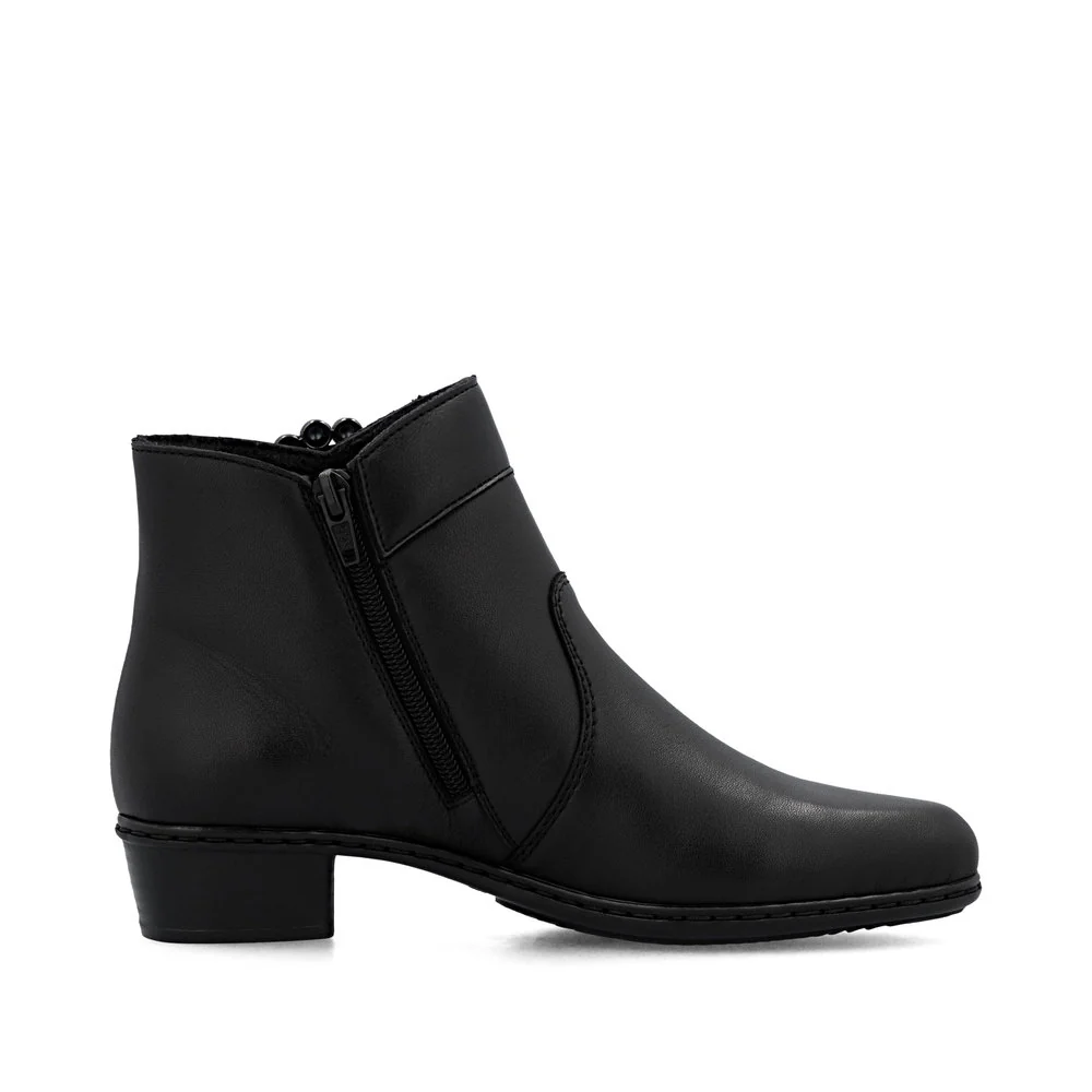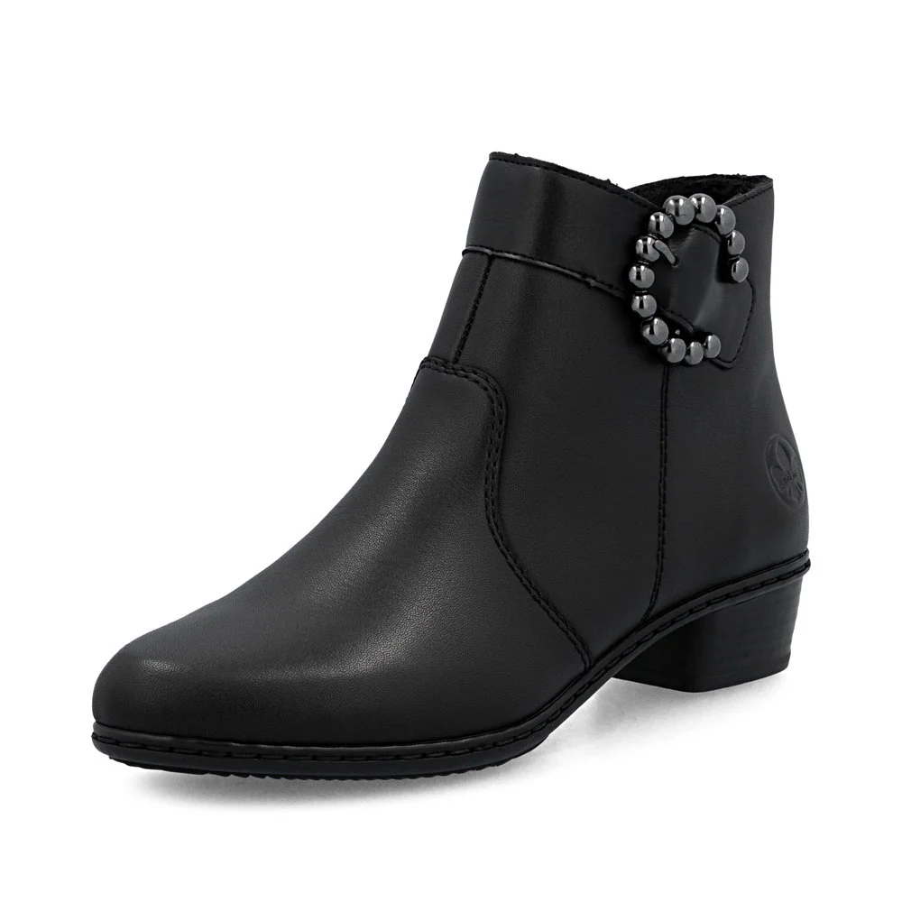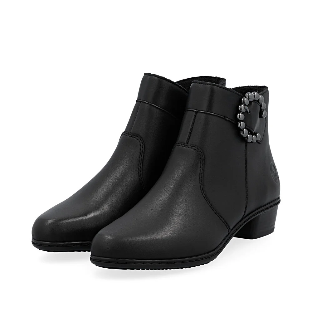 All-time favourite! These black Rieker ankle boots made of smooth leather have it all: comfort, function and, of course, style. The stitchdown construction makes the shoe robust and the sole particularly flexible. A zipper allows for quick and easy donning. The trendy buckle harmoniously rounds off the look of the shoe. With the shock-absorbing and light sole with block heel, your feet will be pampered at every step. Nothing stands in the way of long walks!