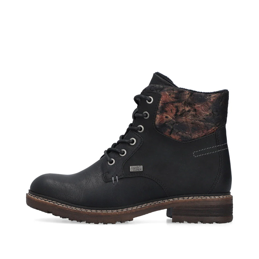 Easy walking, easy living! These casual Rieker lace-up boots are simple and practical. The lacing complements the zipper for functionality and comfort. The multi-coloured pattern on the shaft adds that certain something. The grippy sole provides good support. Thanks to the water-repellent RiekerTEX membrane, the best comfort is ensured even on wet and cold days. Nothing stands in the way of long walks!